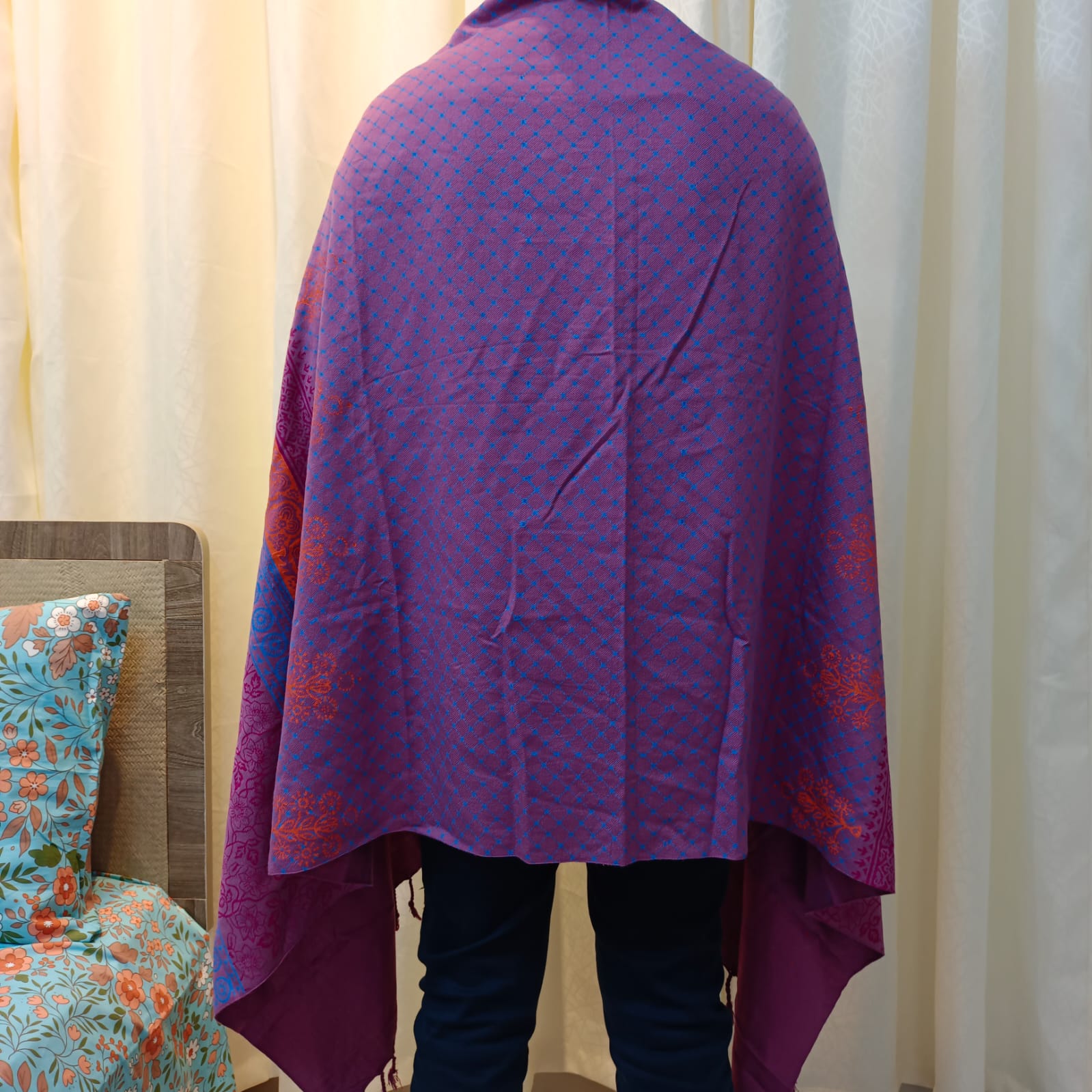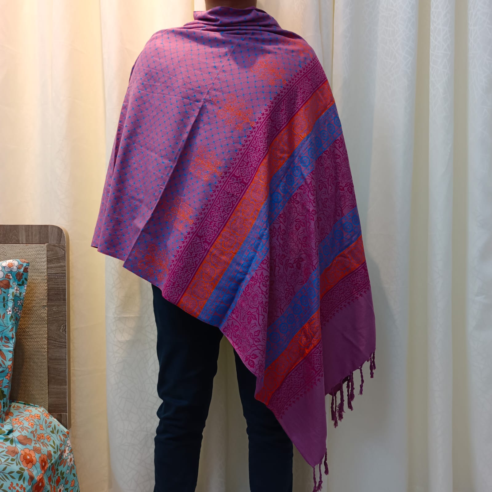 -27%Purple Texture Viscose Shawl with Orange, Megenta and Sky Prints.